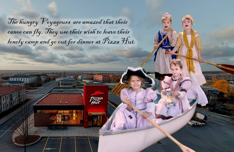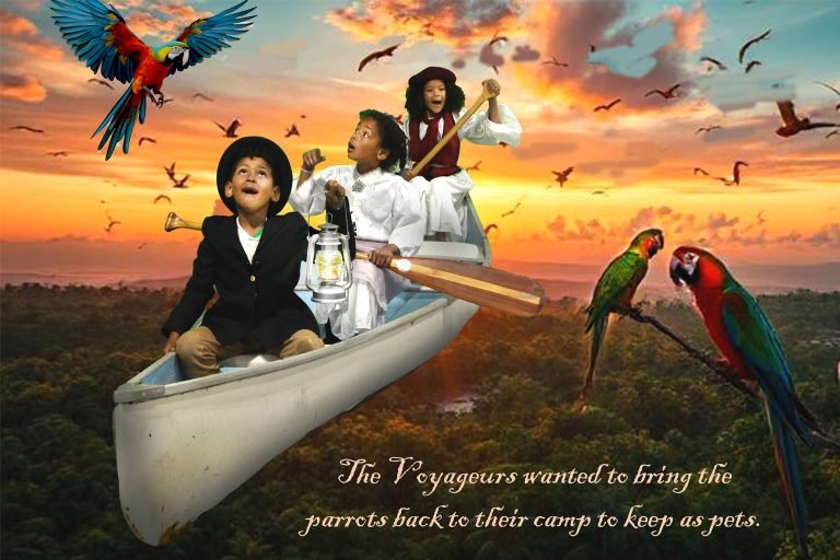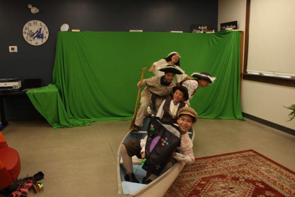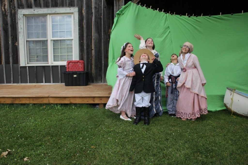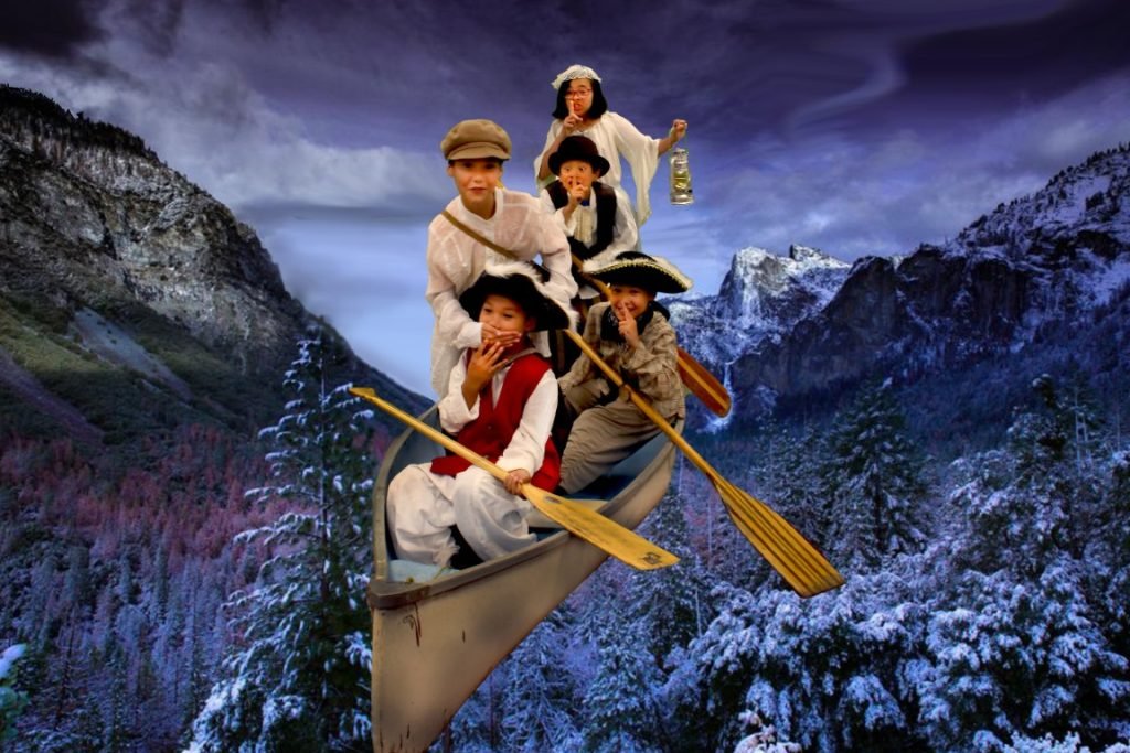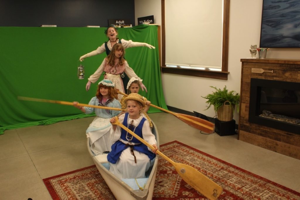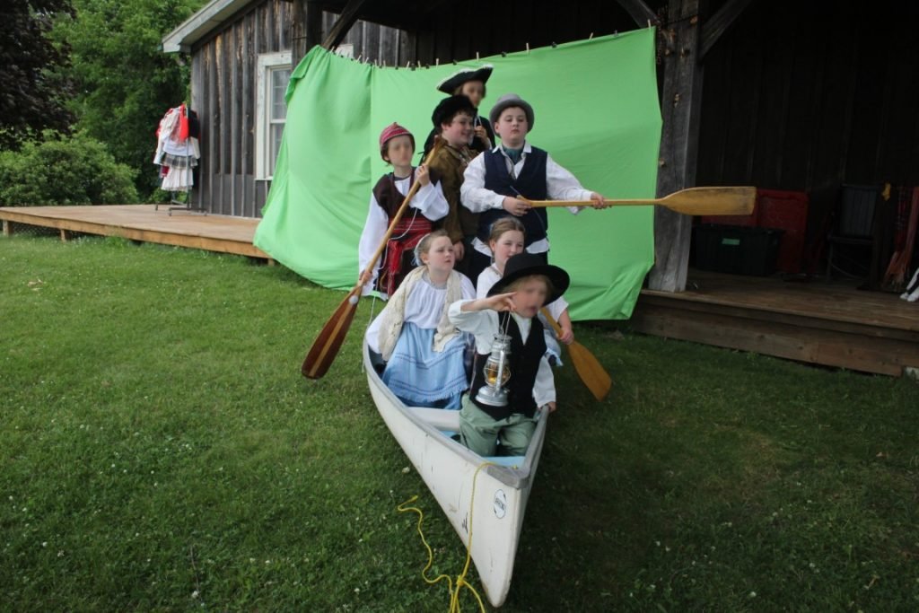 The adventure “takes flight” when, one night, a shadowy figure approaches their campfire and promises to enchant their canoe to take them to their hearts’ desire. The small voyageurs then act out their “choose your own adventure” in front of a green screen.