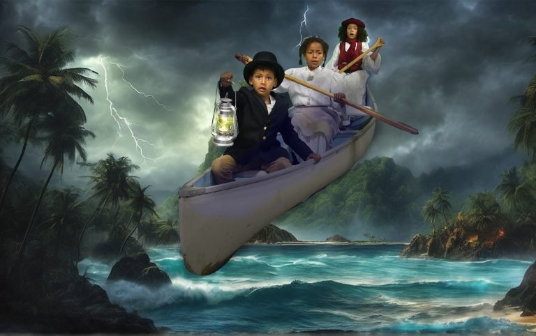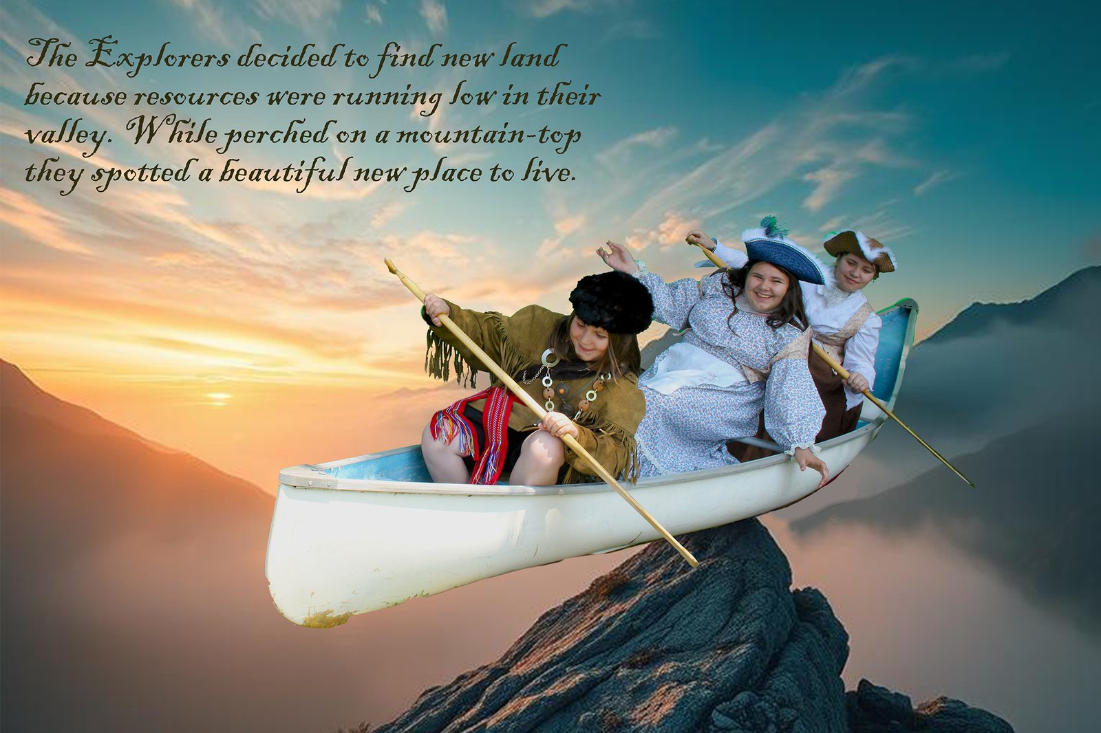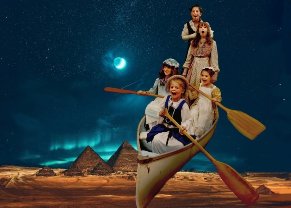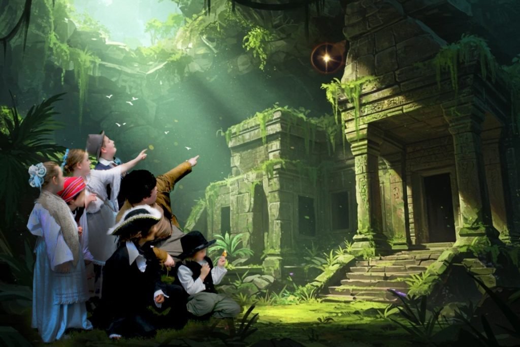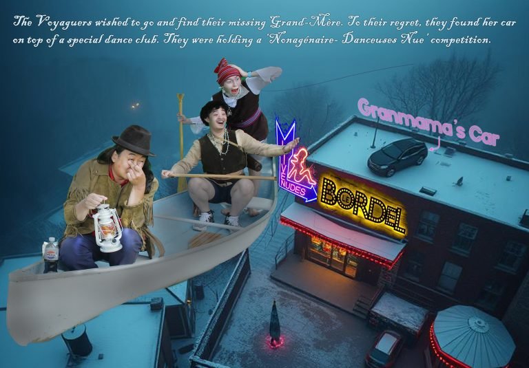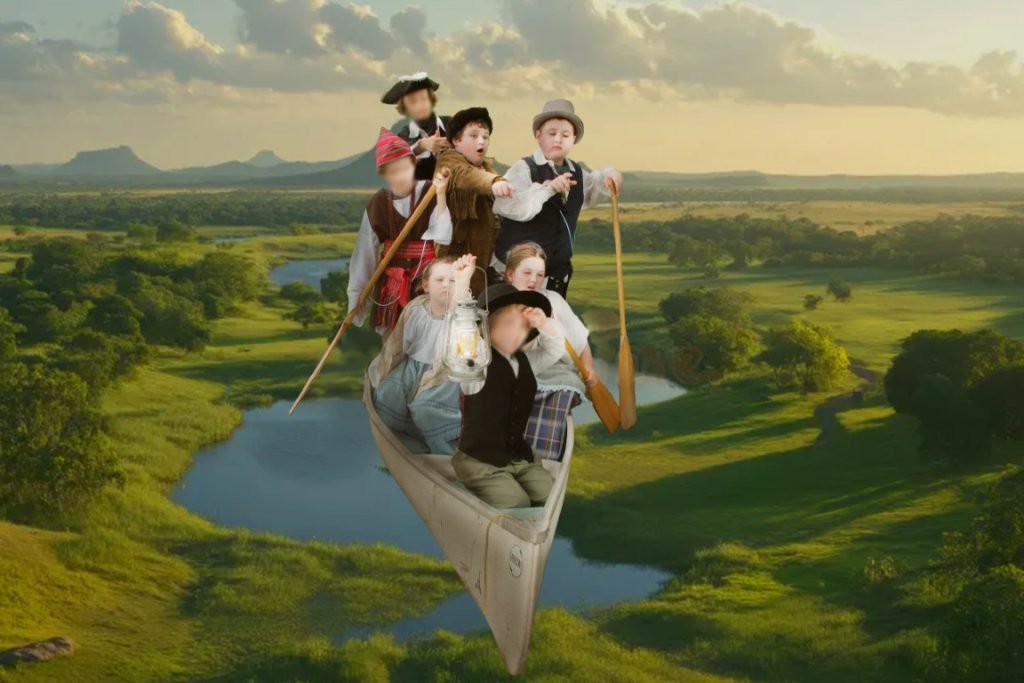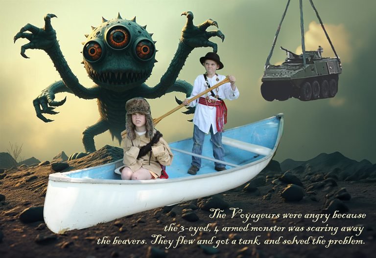The adventure “takes flight” when, one night, a shadowy figure approaches their campfire and promises to enchant their canoe to take them to their hearts’ desire. The small voyageurs then act out their “choose your own adventure” in front of a green screen.