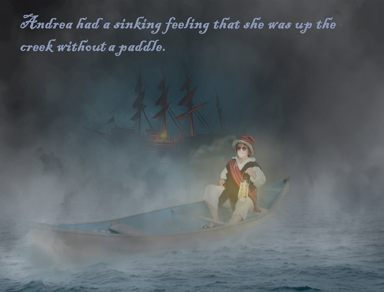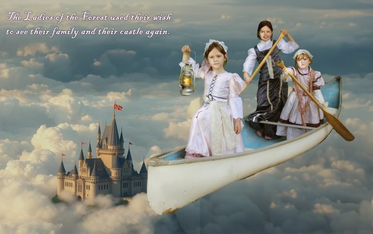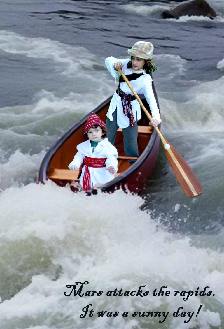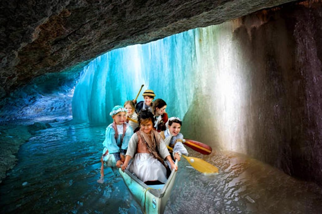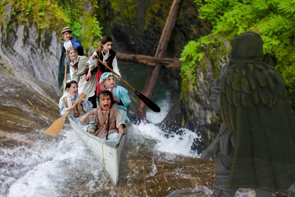 When the shadowy figure appeared, the brave voyageurs lost control of their canoe. Fortunately, they used their wish to land safely, hidden behind the waterfall.